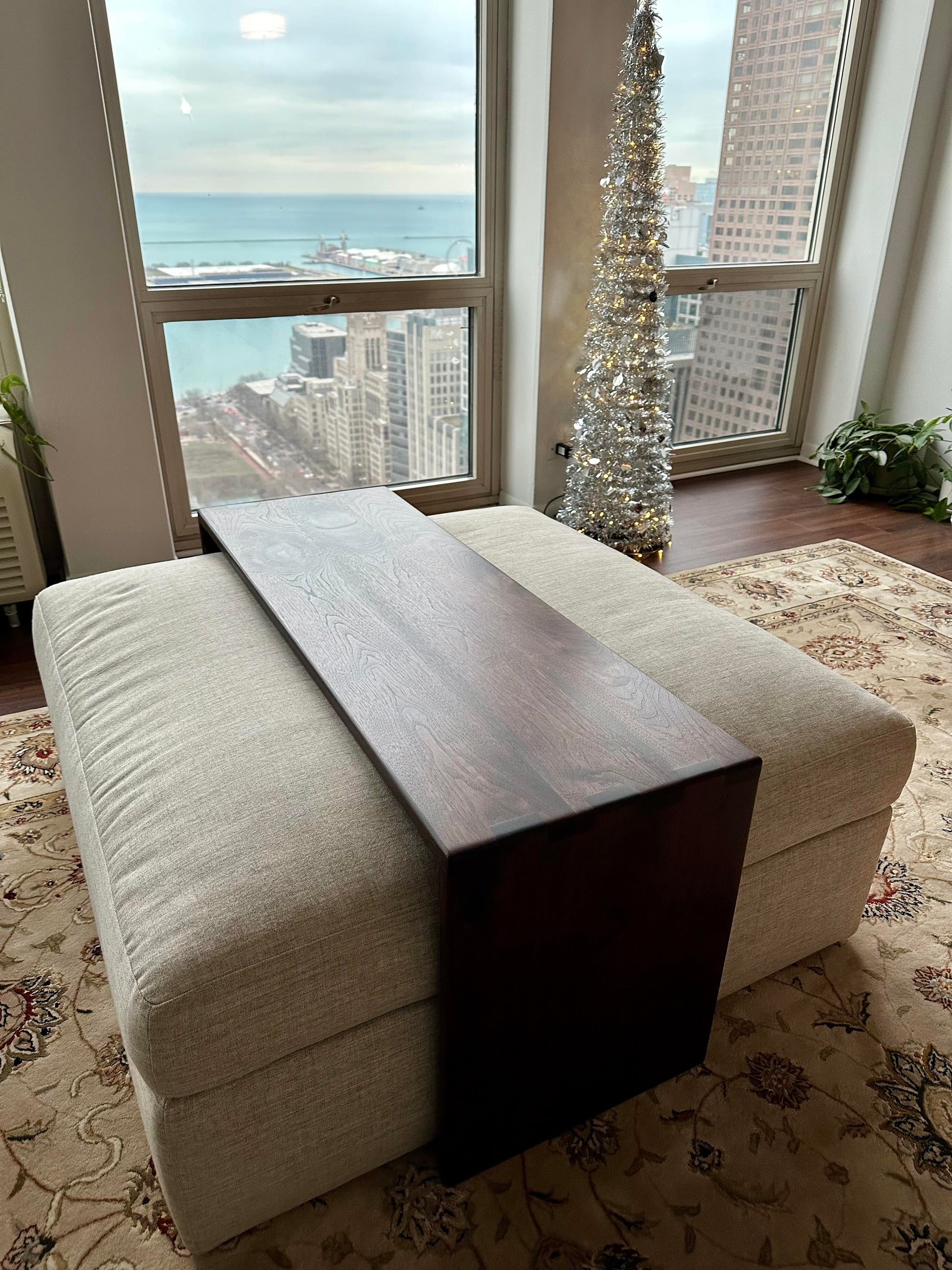 This ottoman coffee table is custom made to YOUR ottoman. The over ottoman table is a stylish way to add the function of a coffee table to your fabric or leather ottoman. And since each table is handmade, I’m able to custom build it according to your specific ottoman.