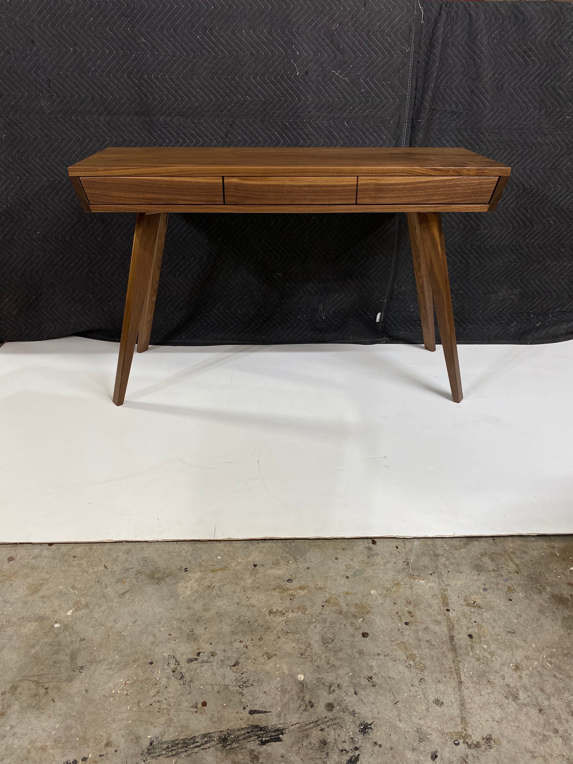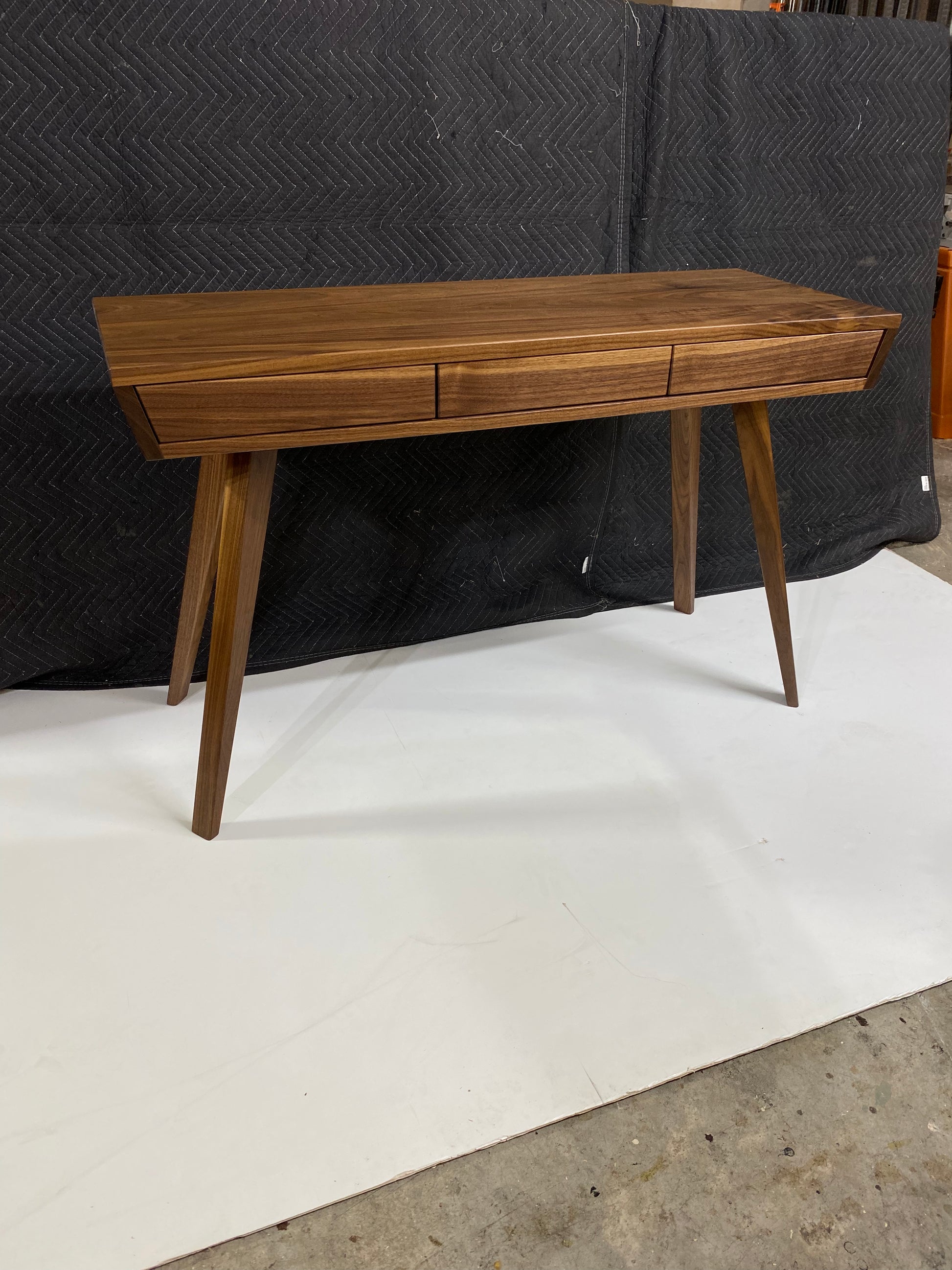 My mid century modern walnut desk is designed to be an inspiring area to work and create. The beautiful and interesting walnut is finely finished to give the most luster to the walnut while being maximally durable.